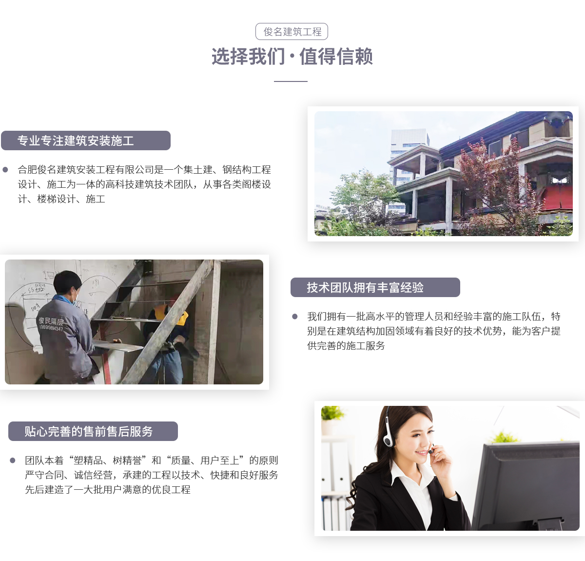 - 合肥俊名建筑安裝工程有限公司是一個(gè)集土建、鋼結(jié)構(gòu)工程設(shè)計(jì)、施工為一體的高科技建筑技術(shù)團(tuán)隊(duì),從事各類閣樓設(shè)計(jì)、施工。我們擁有一批高水平的管理人員和經(jīng)驗(yàn)豐富的施工隊(duì)伍,特別是在建筑結(jié)構(gòu)加固領(lǐng)域有著良好的技術(shù)優(yōu)勢。團(tuán)隊(duì)員工精誠團(tuán)結(jié),以“尊重規(guī)范,拒絕平凡”為宗旨,為客戶提供完善的施工服務(wù)。團(tuán)隊(duì)本著“塑精品、樹精譽(yù)”和“質(zhì)量、用戶至上”的原則,嚴(yán)守合同、誠信經(jīng)營,所...